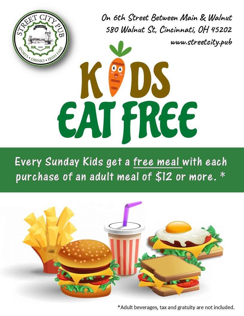 You get one free kid's meal for each adult entree of $12 or more. Remember, this is only for dine-in meals and can't be combined with other offers or coupons. Street City Pub – Every Sunday kids eat free Kids must be 10 or younger, and the deal is only from 11am – 9 pm.