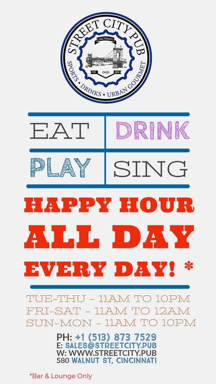 You get one free kid's meal for each adult entree of $12 or more. Remember, this is only for dine-in meals and can't be combined with other offers or coupons. Street City Pub – Every Sunday kids eat free Kids must be 10 or younger, and the deal is only from 11am – 9 pm.
